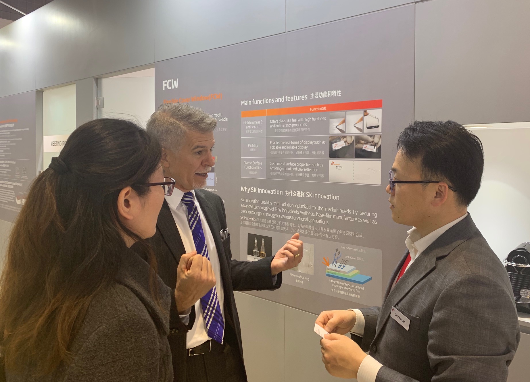▲SK이노베이션 직원이 부스에 방문한 업계 관계자들을 대상으로 제품에 대해 설명하고 있다.