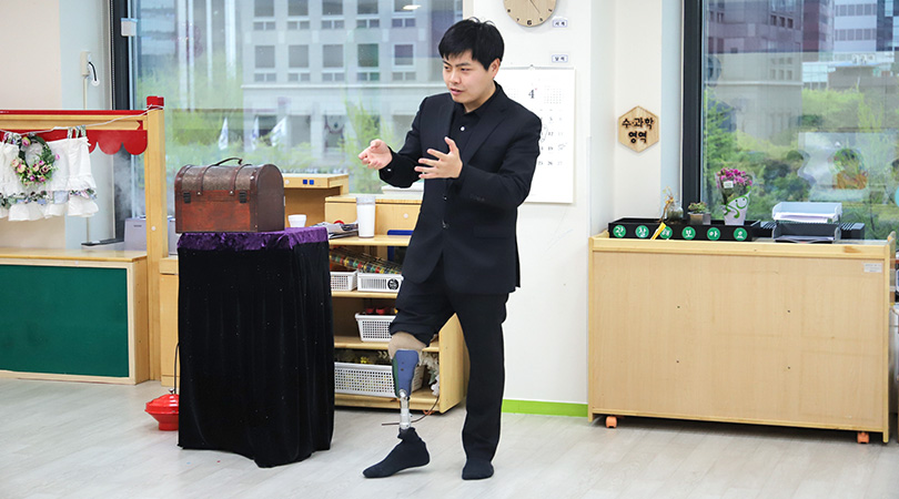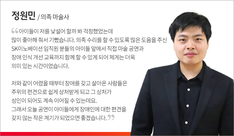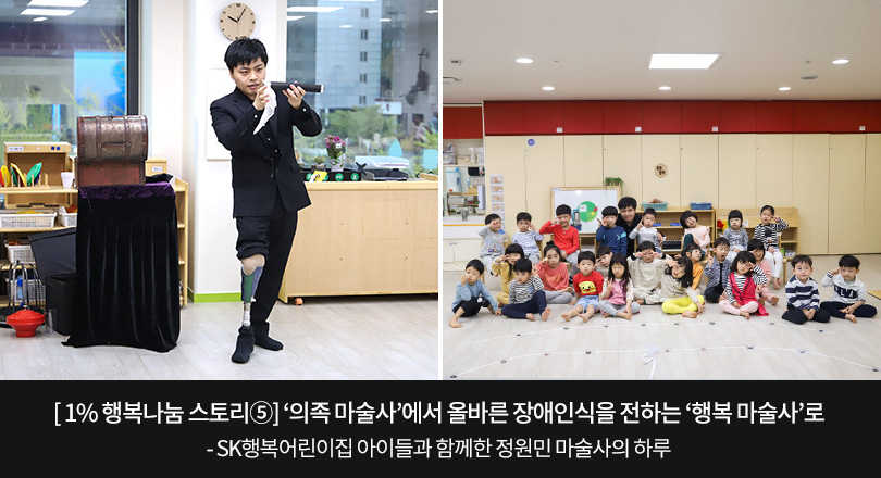 장애인의 날(4월 20일)을 앞둔 지난 4월 18일, 의족 마술사 정원민 씨가 SK이노베이션 본사(서린빌딩)에 위치한 SK행복어린이집을 찾아 특별한 공연을 진행했다. SK이노베이션의 사내 어린이집인 ‘SK행복어린이집’ 아이들에게 장애 인식 개선을 위한 교육과 함께 마술 공연을 선보인 것이다.