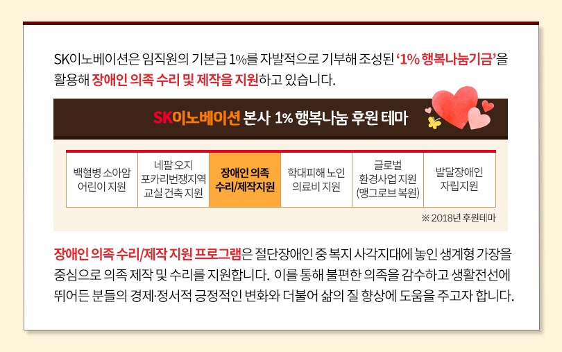 SK이노베이션의 임직원들이 자발적으로 기본급 1%를 기부해 조성한 ‘1% 행복나눔’ 후원으로 의족 수리를 지원받게 된 것이다. 남들 앞에 보이기 꺼려졌던 의족은 새것처럼 윤이 나고 활동하기에 편해졌을 뿐 아니라 이제 하나의 특별한 퍼포먼스 도구가 되었다.