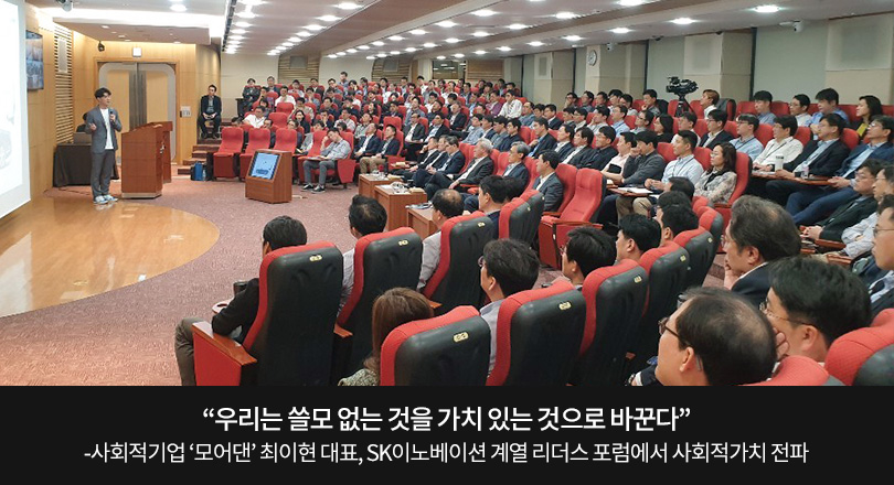 SK이노베이션 김준 총괄사장을 비롯한 각 사(社)를 이끌고 있는 리더들이 한 자리에 모인 리더스포럼에서 최이현 대표는 사회적가치 창출을 통해 혁신, 성장하는 기업 ‘모어댄’의 성공 스토리를 전했다.
