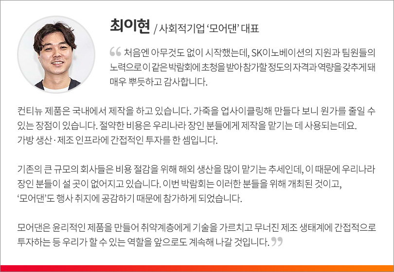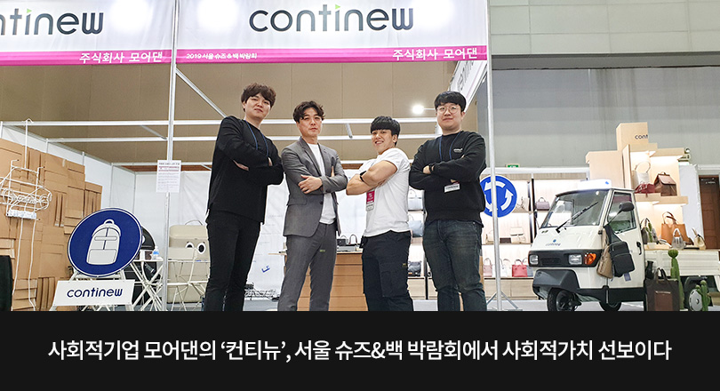 SK이노베이션이 설립 지원한 사회적기업 모어댄의 패션 브랜드 ‘컨티뉴’가 ‘2019 서울 슈즈&백 박람회’에 참가해 환경적 가치와 사회적가치를 함께 담은 제품들을 선보였다.