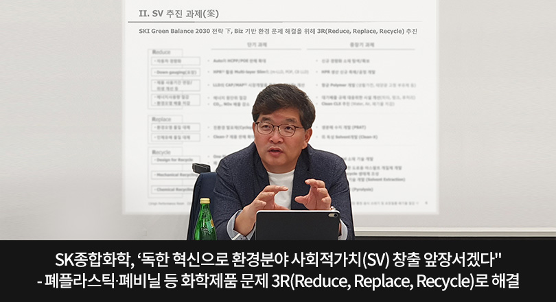 SK이노베이션의 화학사업 자회사 SK종합화학이 비즈니스 중심의 ‘3R(Reduce(최소화)∙Replace(대체제)∙Recycle(재활용)’ 추진을 통해 친환경 사회적가치(SV, Social Value) 창출에 앞장선다.