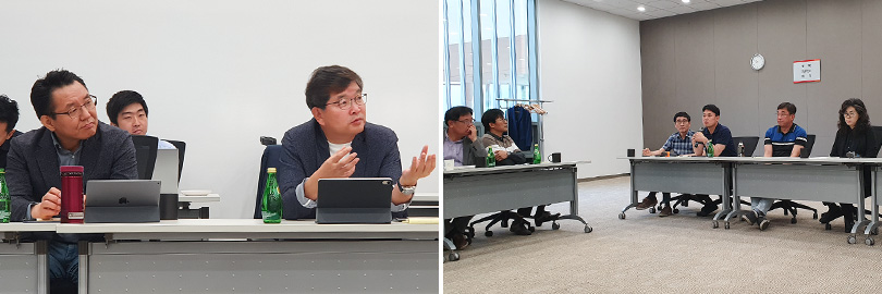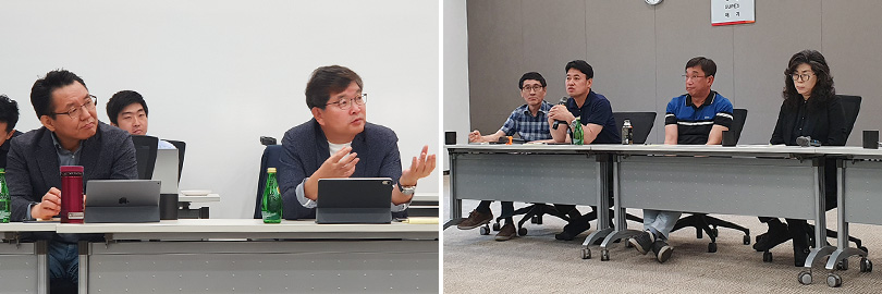 ▲ 지난 6월 4일, ‘친환경 SV임원 워크숍’ 에서 토의 중인 SK종합화학 나경수 사장 (좌측 사진 중 오른쪽) 과 SK종합화학 임원 (우측 사진)