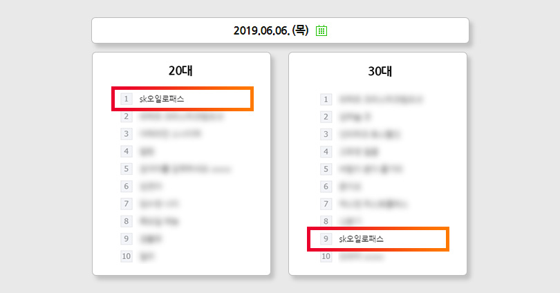SK오일로패스는 캠페인 런칭일인 6월 5일, 포털사이트 네이버에서 집계한 20대 실시간 검색어 5위에 오른 것을 시작으로 6일에는 1위, 7일에는 2위를 기록했다. 뿐만 아니라 30대 실시간 검색어 순위에서도 10위권 안에 들며 그 인기를 입증했다.