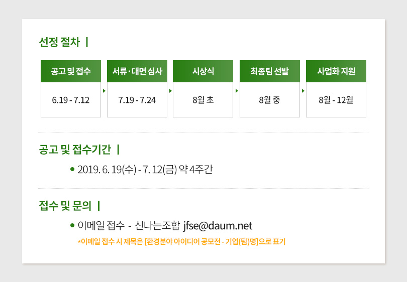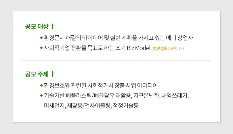 이번 공모전은 환경문제 해결의 아이디어 및 실현 계획을 가지고 있는 예비 창업자 혹은 ‘사회적기업’ 전환을 목표로 하는 기업 (공고일 기준 법인설립 2년 이내 기업)’이면 지원 가능하다.