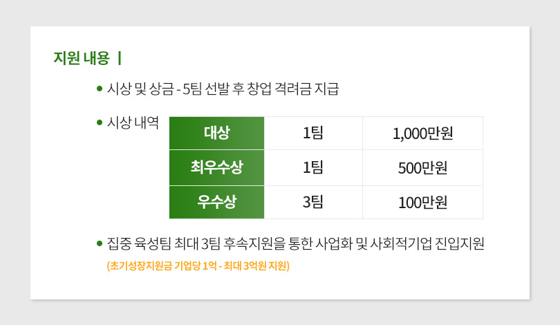 사업모델의 적합성 (혁신성 및 환경분야 사회가치 지향성), 사회적가치 확장성, 실현가능성 등을 기준으로 심사하며, 선정된 다섯 팀에게는 총 1,800만 원의 상금이 주어지며, 이중 ‘집중 육성팀’으로 선정된 최대 3팀에게는 1억 원에서 3억 원 이내의 초기성장지원금 등 다양한 지원을 통한 사업화 및 사회적기업 진입이 가능하도록 도움을 줄 예정이다. 또한, 사업 연계성 검토를 통해 임팩트 투자 지원, SK이노베이션 계열 사업과 연계한 사업모델 개발 지원 등 추가 후속지원도 예정돼 있다.