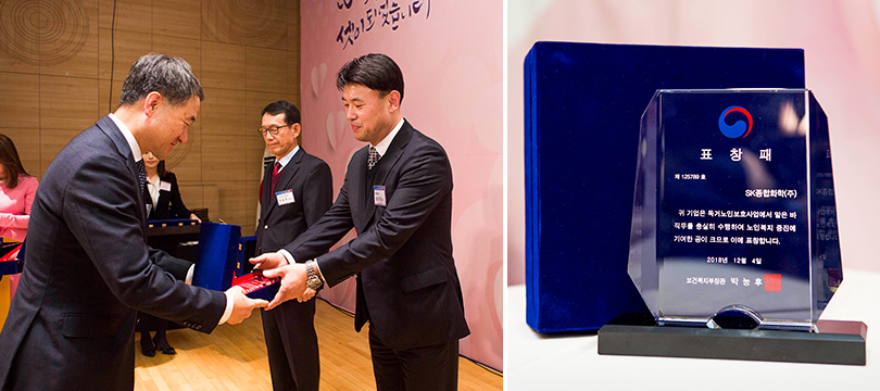 ▲ 지난해 12월, SK종합화학이 독거노인보호사업 유공 단체로 선정돼 ‘보건복지부 장관 표창’ 수상했다.