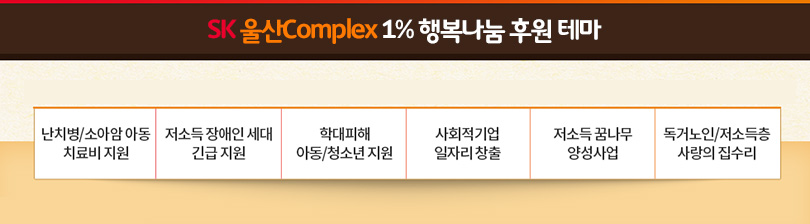 SK 울산CLX의 ‘1% 행복나눔 기금’은 지난 2017년부터 SK 울산CLX 임직원들이 자발적으로 매월 기본급의 1%를 기부해 조성된 기금으로 후원 테마를 가지고 지역사회의 다양한 복지를 위해 사용되고 있다.
