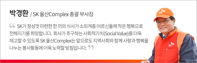 이날 행사에는 SK 울산CLX 박경환 총괄 부사장과 이정묵 노동조합위원장을 비롯한 SK이노베이션 경영진, 노동조합 전임자 20여 명이 함께해 소외계층 어르신들께 보양식 삼계탕과 떡, 과일 등을 직접 대접하며 따뜻한 사랑의 마음을 전했다.