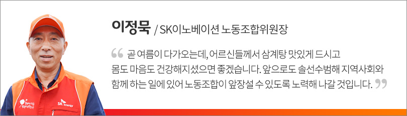 식당을 찾은 한 어르신은 “이렇게 정성으로 만들어준 삼계탕 맛 나게 먹고 다가오는 여름 강하게 잘 넘겨 볼랍니다.”라고 말하며, 음식을 준비해준 SK임직원들에게 감사의 마음을 전했다.