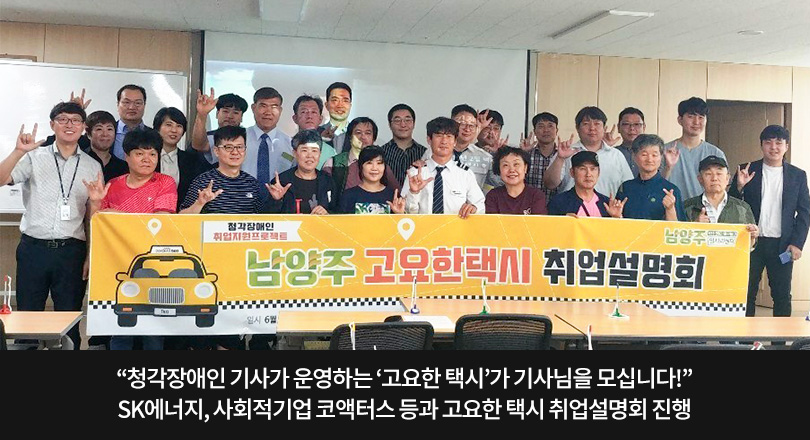 지난 27일, 경기도 남양주시 고용복지플러스센터에서 청각장애인 기사가 운전하는 택시 서비스인 ‘고요한 택시’의 취업설명회가 진행됐다. 남양주시 거주 청각장애인을 대상으로 진행된 이번 설명회는 ‘고요한 택시’ 서비스를 홍보하고, 택시 기사 채용 기회를 제공하기 위해 열렸으며, SK에너지와 SK텔레콤, 사회적 기업 ‘코액터스’와 남양주시가 공동으로 개최했다.