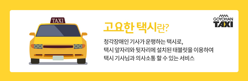 ‘고요한 택시’는 사회적기업인 코액터스가 청각장애인 일자리 창출을 목표로 지난해 6월 런칭한 택시서비스로, 청각장애인 기사와 승객이 의사소통할 수 있는 모바일 앱을 개발해 청각장애인이 택시기사로 일할 수 있는 환경을 만들어 냈다. SK에너지, SK텔레콤은 고요한 택시 서비스 활성화를 위해 지난 3월, 코액터스와 MOU를 체결한 바 있다.