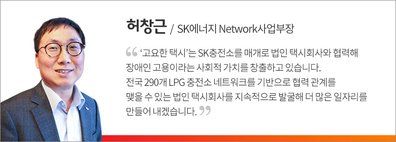 SK에너지는 SK충전소 네트워크를 이용하는 법인택시 회사를 연결해 청각장애인의 일자리 창출을 돕고, 법인 택시회사에 청각장애인 고용에 따른 인센티브를 지급한다. 전국 290개 SK LPG 충전소 네트워크에 연계된 법인택시회사에 ‘고요한 택시’를 적극 홍보하고 지역간 매칭을 통해 청각 장애인 일자리 확대라는 사회적 가치를 창출하고 있다. SK텔레콤은 청각장애인 기사를 위한 T맵 택시 앱을 개발하고, 콜 수락의 편의성을 높이기 위한 ‘콜잡이’ 버튼을 제공하고 있다.