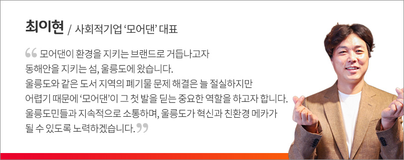 이를 통해 ‘모어댄’은 자체적으로 울릉도 거주 청년들과 해양 폐기물 처리 방안을 함께 모색할 예정이며, 실제 울릉도 폐기물을 활용한 제품 생산을 목표로 연구를 진행할 계획이다. 또한, 울릉도에서 나온 폐기물로 친환경 업사이클링 기념품을 제작해 환경보호에 앞장설 생각이다.