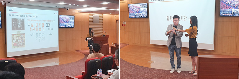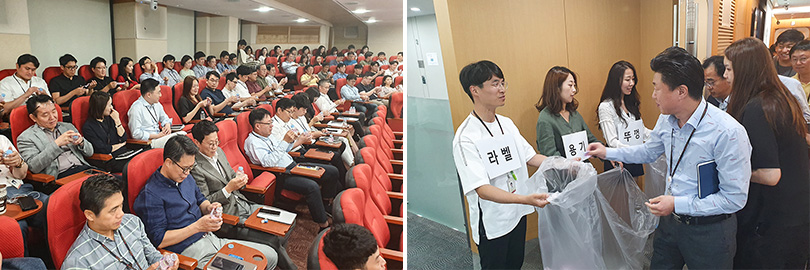 ▲ SK종합화학 임직원들에게 ‘뜯버’를 소개하는 모습(좌) 나경수 사장이 시연하는 모습(우)