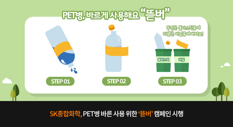 SK종합화학은 플라스틱 소재를 생산하는 기업으로서 전세계적으로 대두되고 있는 폐플라스틱 문제에 주목, 플라스틱의 바른 사용을 통해 재활용률을 높이자는 취지로 임직원이 직접 참여하는 PET병 바른 사용 캠페인 ‘뜯버’를 추진했다.
