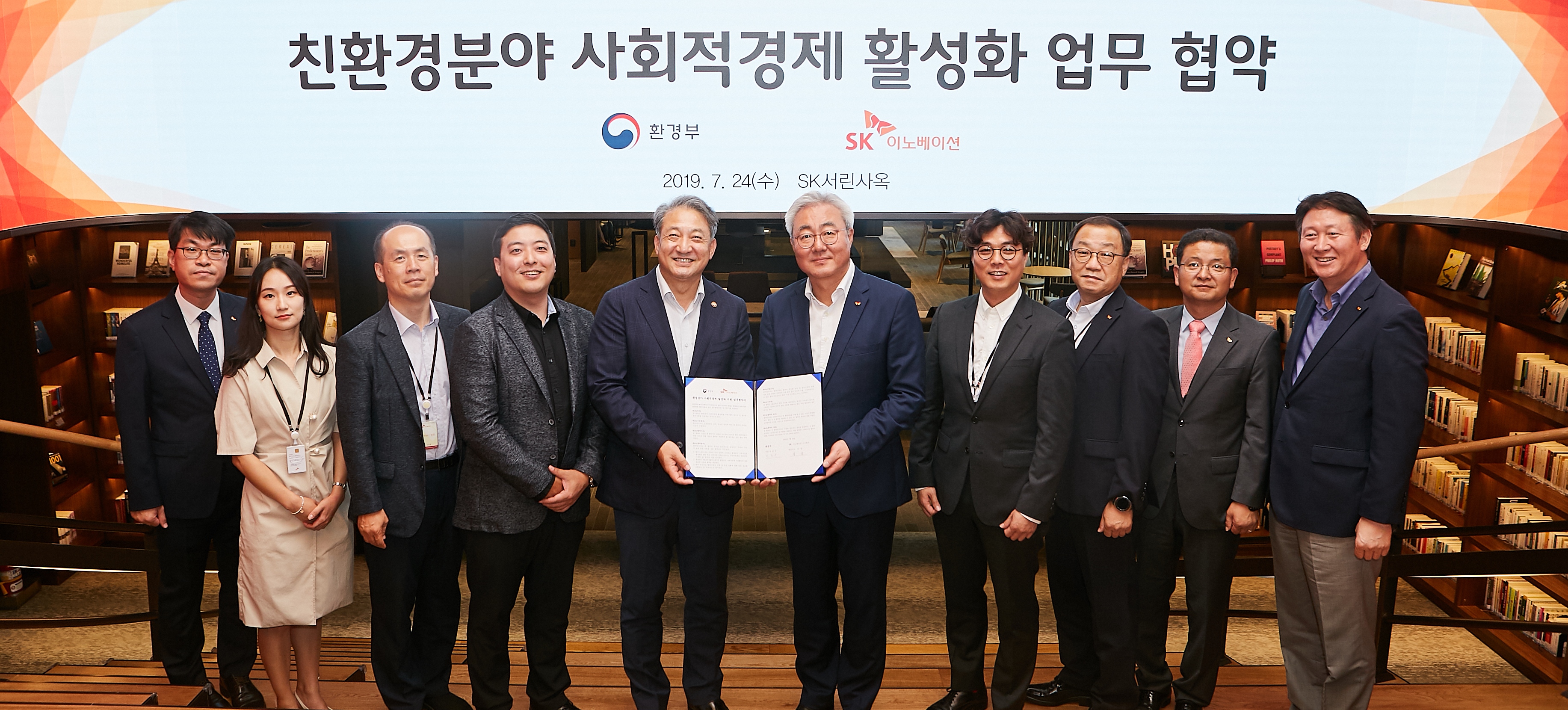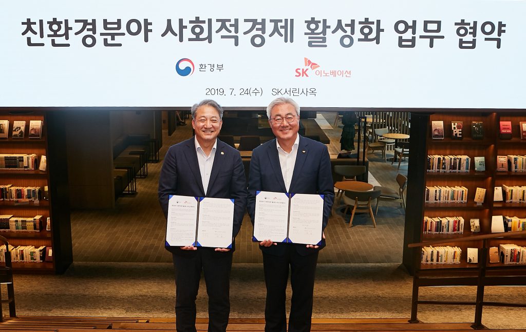 환경부(장관 조명래)와 SK이노베이션(대표이사 사장 : 김준, www.SKinnovation.com)이 24일, 서울 종로구 SK서린빌딩에서 ‘환경 분야 사회적경제 활성화를 위한 업무 협약식(MOU)’을 가졌다.