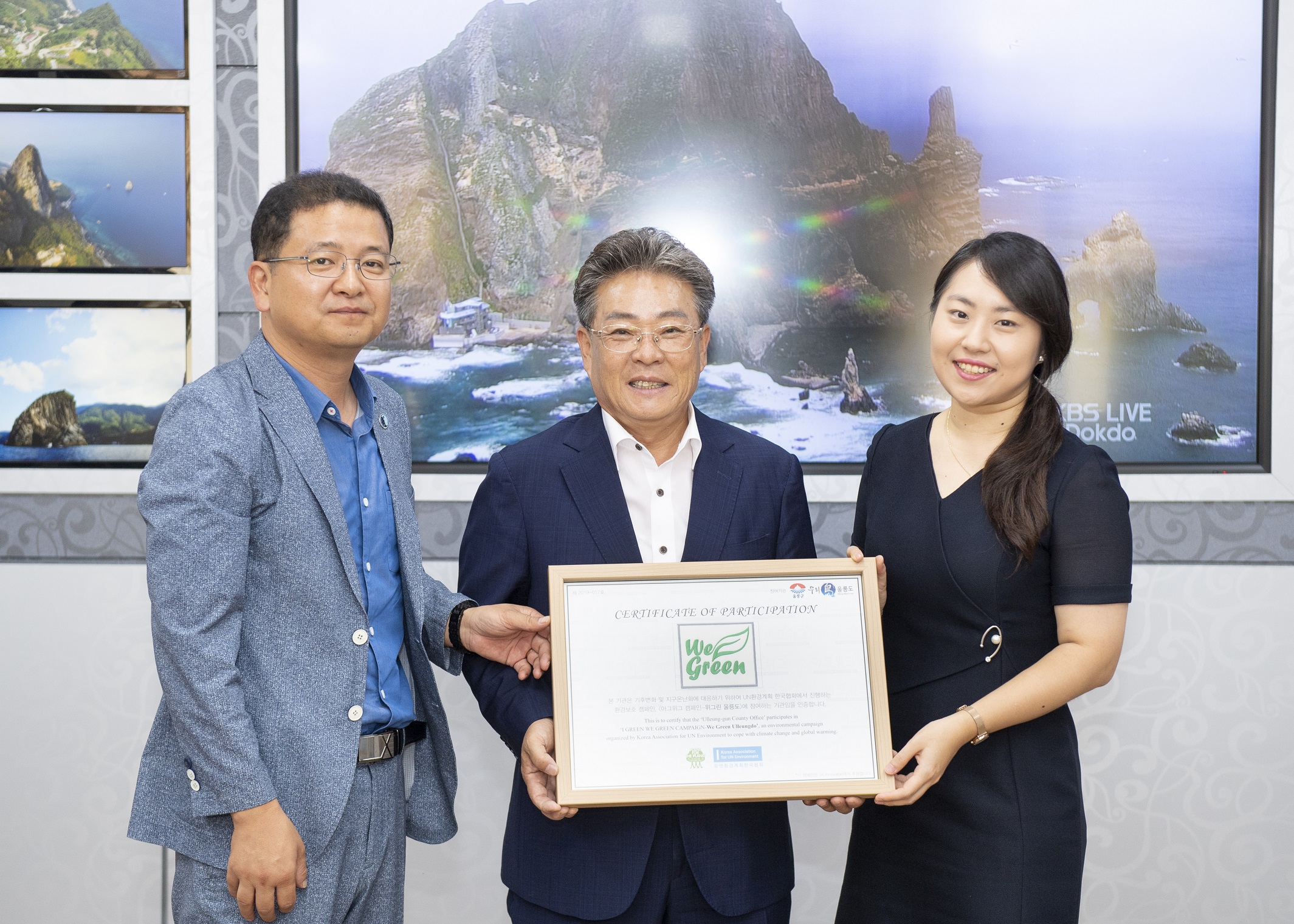 (왼쪽부터) SK이노베이션 홍보실 박현섭 팀장, 김병수 울릉군수, UN환경계획 한국협회 장수아 팀장이 기념 사진을 촬영하고 있다.
