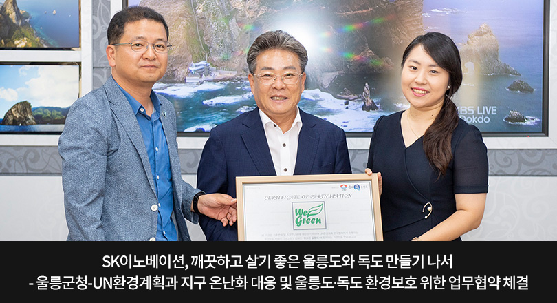 SK이노베이션, 울릉군청, UN환경계획 한국협회는 7월 30일, 지구 온난화 대응 및 울릉도와 독도 환경보호를 위한 업무협약(MOU)을 체결했다.