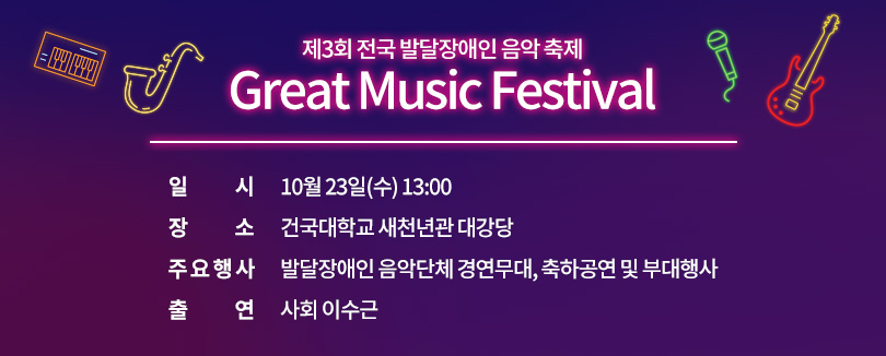 GMF 본선에서는 6개 팀의 경연은 물론, 성재창 트럼피터와 발달장애인 음악인과의 협연 등 다채로운 행사도 함께 만날 수 있다. 뿐만 아니라 지난해 GMF에서 사회를 봤던 개그맨 이수근은 올해도 사회를 담당한다.
