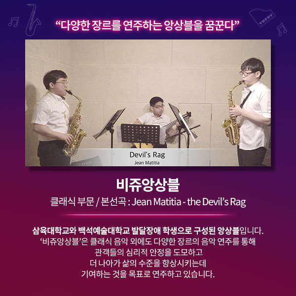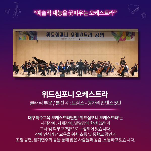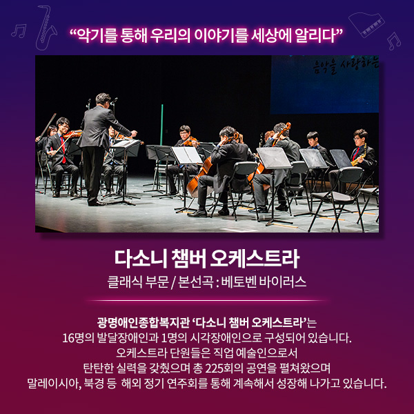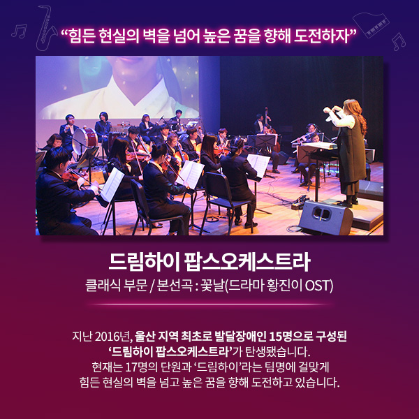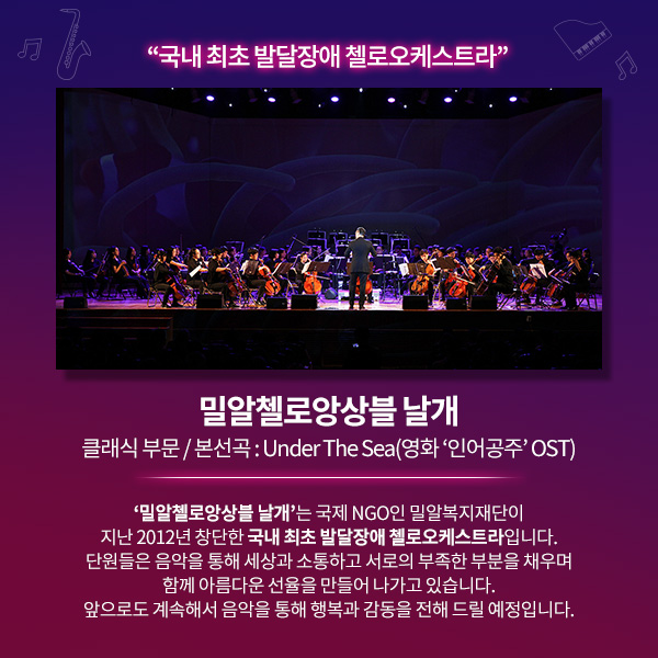 본선에 진출할 6개 팀은 ▲클래식 분야 5개 팀(다소니 챔버 오케스트라, 드림하이 팝스오케스트라, 밀알첼로앙상블 날개, 비쥬앙상블, 위드심포니 오케스트라)과 ▲실용음악 분야 1개 팀(해와달밴드)이다. 엄격한 심사를 거쳐 본선에 진출하게 된 6개 팀을 지금부터 소개한다.