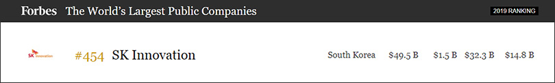한편 SK이노베이션은 지난 5월 15일, 미국 경제전문지 포브스(Forbes)가 발표한 2019년 ‘포브스 글로벌 2000 기업’에서도 454위에 선정된 바 있다.