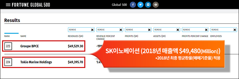 | SK이노베이션은 포춘 글로벌 500대 기업 중 223위와 224위 사이