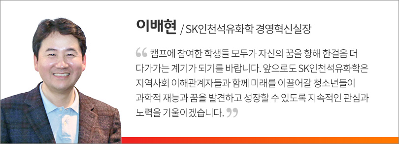 중등과학미션캠프는 과학기술진흥기금과 복권기금의 재원 및 한국과학창의재단의 지원을 받아 진행된다. SK인천석유화학은 미래 지역 인재 육성을 위해 이번 중등과학미션캠프 지원을 결정했다.