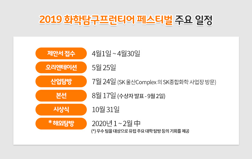 올해 참가 학생들은 지난 5월, 오리엔테이션을 통해 ‘화학탐구프런티어페스티벌’ 취지와 심사 기준 등을 확인하는 시간을 가졌다. 이어 7월에는 산업탐방 프로그램을 통해 글로벌 Top-tier 수준의 에너지∙화학 공장인 SK 울산Complex의 SK종합화학 사업장을 방문하여 산업공정을 체험한 바 있다.