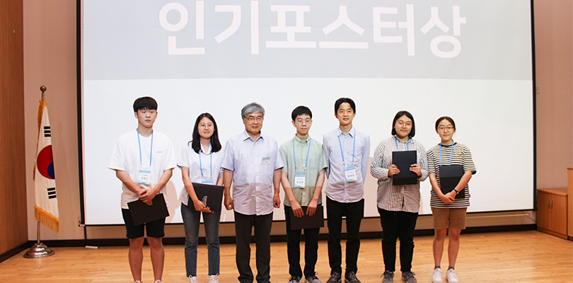 ▲ 인기포스터상을 수상한 (좌측부터) ‘버들빨대’팀 2인, 김종득 심사위원장, ‘diffusion’팀 2인, ‘Defying Chicken’ 2인
