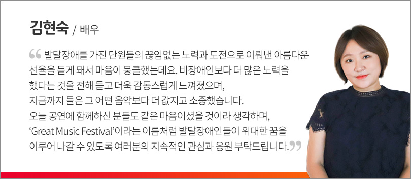 ‘발달장애인들의 음악에 대한 꿈과 도전’을 주제로 진행된 ‘SK 토크 콘서트’에는 드라마 ‘막돼먹은 영애씨’로 유명한 배우 김현숙 씨가 사회를 맡아 재능기부에 나섰다. 하트하트 홍보대사이기도 한 김현숙 씨는 “발달장애인의 꿈을 응원하는 뜻 깊은 자리에게 참여하게 되었다. 오늘 이 자리가 ‘KAF’와 관람객 여러분 모두에게 값진 시간이 되었으면 좋겠다”고 말하며 콘서트의 포문을 열었다.