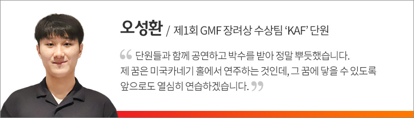 이날 KAF는 Queen의 ‘보헤미안 랩소디’를 첫 곡으로 선보였으며, 제1회 GMF 본선 경연 곡이기도 한 모차르트 오페라 ‘마술피리 서곡’을 연주해 관객들의 열띤 환호를 받았다.