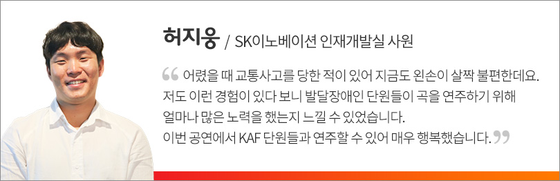또한, KAF는 SK이노베이션 인재개발실 허지웅 사원과 함께 ‘고향의 봄’, ‘도레미 송’ 등을 연주하는 등 깜짝 합동 공연을 펼쳐 눈길을 끌었다. 관객으로 참석한 SK이노베이션, SUPEX추구협의회, SK㈜, SK E&S 등 SK 관계사 임직원들은 화합을 통해 만든 아름다운 선율에 한층 더 뜨거운 호응을 보였다. 이에 질세라 김현숙氏도 ‘월광 1악장’을 현장에서 즉흥 연주하며 그동안 숨겨왔던 피아노 솜씨를 공개해 눈길을 끌었다.