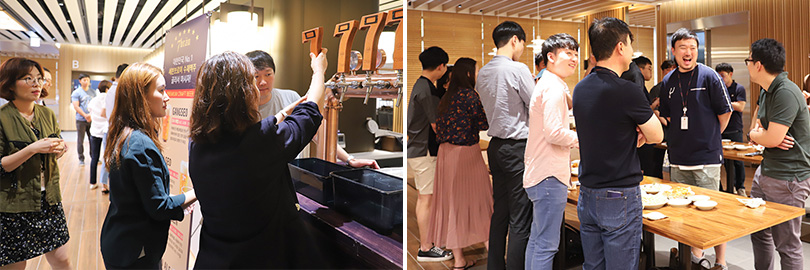 퀴즈 대결이 끝난 뒤에는 신입사원부터 임원까지 全 직급의 임직원이 한 자리에 모여 맥주와 함께 준비된 음식을 나눠 먹으며 격의 없는 소통의 시간을 가졌다.