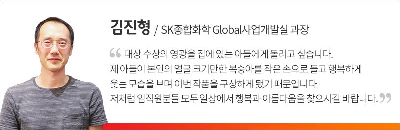 사내 심사를 통해 이중 SK종합화학 Global사업개발실 김진형 과장의 ‘일상의 아름다움’이 문예 부문 대상으로 선정됐으며, SK이노베이션 전략본부 김현석 PL의 ‘아들이 머리를 기른 이유’가 사진 부문 대상으로 선정돼 수상의 영광을 누렸다.