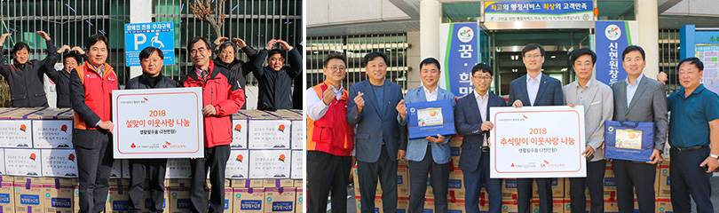▲ 지난 2018년 설(좌측)과 추석(우측)에 진행된 SK인천석유화학의 ‘이웃사랑 나눔’ 전달식