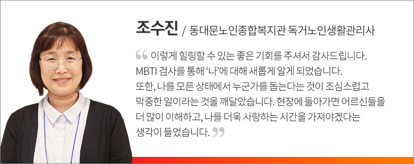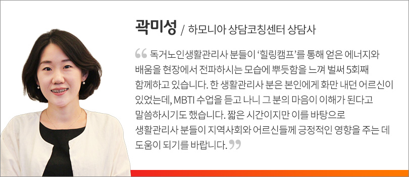 이어 SK이노베이션 하모니아 상담코칭센터 곽미성 상담사와 함께하는 ‘나를 만나는 여행’이 진행됐다. 생활관리사들은 MBTI*검사를 통해 나와 타인을 성찰하는 시간을 가졌다.