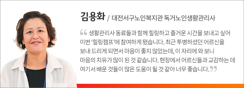 이번에도 함께한 김현미 독거노인종합지원센터의 센터장은 “힐링캠프에 오시는 생활관리사분들의 만족도가 높아 독거노인 분들께도 좋은 파급효과를 가진다”며 “이 곳에서 받은 힐링을 어르신분들께도 부디 전파하시기를 바라며, 앞으로도 많은 노력 부탁드린다”고 당부했다.