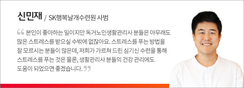 SK이노베이션은 더 많은 독거노인생활관리사들이 힐링하고 재충전할 수 있도록 ‘마음행복 힐링캠프’ 등 다양한 지원을 지속할 예정이다.