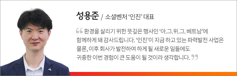 다음으로 SK이노베이션은 ‘아.그.위.그. 베트남’을 영상으로 소개했으며, 행사 참여 기관 및 기업 관계자들과 맹그로브 나뭇잎 모양의 명패에 서명을 한 뒤 나무에 매다는 퍼포먼스로 캠페인에 동참할 것을 약속했다.