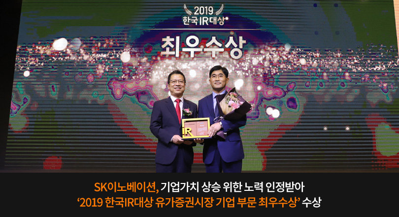 SK이노베이션은 10월 2일, 한국IR협의회가 주최한 ‘2019 한국IR대상’ 유가증권시장 기업부문에서 한국거래소이사장상인 ‘최우수상’을 수상했다.