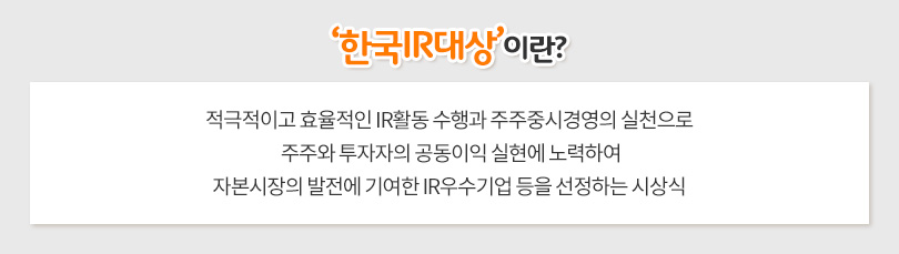 (*) IR(Investor Relations) : 기업이 자본시장에서 정당한 평가를 얻기 위하여 주식 및 사채 투자자들을 대상으로 실시하는 홍보 활동