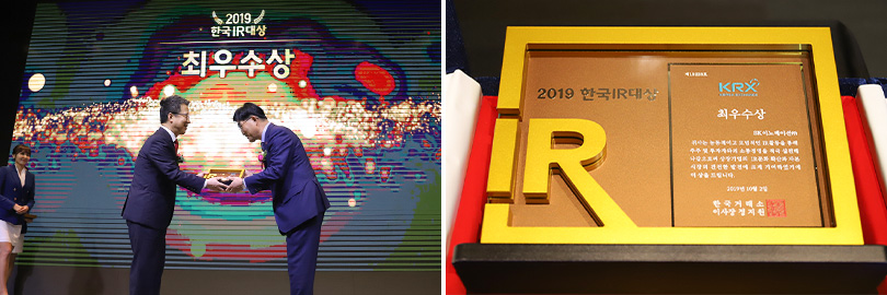 ‘한국IR대상 유가증권시장 기업 부문 최우수상’을 전달받고 있다.