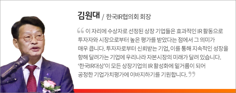 한국IR협의회는 지난 2001년부터 매해 IR 활동을 통해 자본 시장 발전에 기여한 우수 기업과 임직원에게 ‘한국IR대상’을 시상하고 있다. 이 상은 기관투자자 및 애널리스트들의 추천을 통해 1차 후보군이 선정되며, 이후 기관투자자평가단과 한국IR대상선정위원회의 심사를 거쳐 최종 수상자가 발표된다.