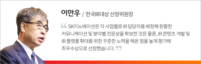 SK이노베이션은 지난 2013년에도 ‘한국IR대상’ 유가증권시장 기업 부문 우수기업군에 선정된 바 있다. 이후 투자자들과 적극적인 소통을 지속해온 결과, 올해는 ‘최우수상’을 수상했다.