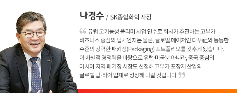 SK종합화학은 고부가 포장재 사업을 차세대 성장 주력 분야로 선정하고 관련 포트폴리오 확보에 주력해 지난 2017년 美 다우社로부터 접착층과 차단층 핵심소재인 에틸렌 아크릴산(Ethylene Acrylic Acid, 이하 EAA)과 폴리염화비닐리덴(Poly Vinylidene Chloride, 이하 PVDC) 사업을 인수하며, 북미 지역 사업 확장과 동시에 패키징(Packaging) 사업의 중요한 성장 기반을 마련했다.