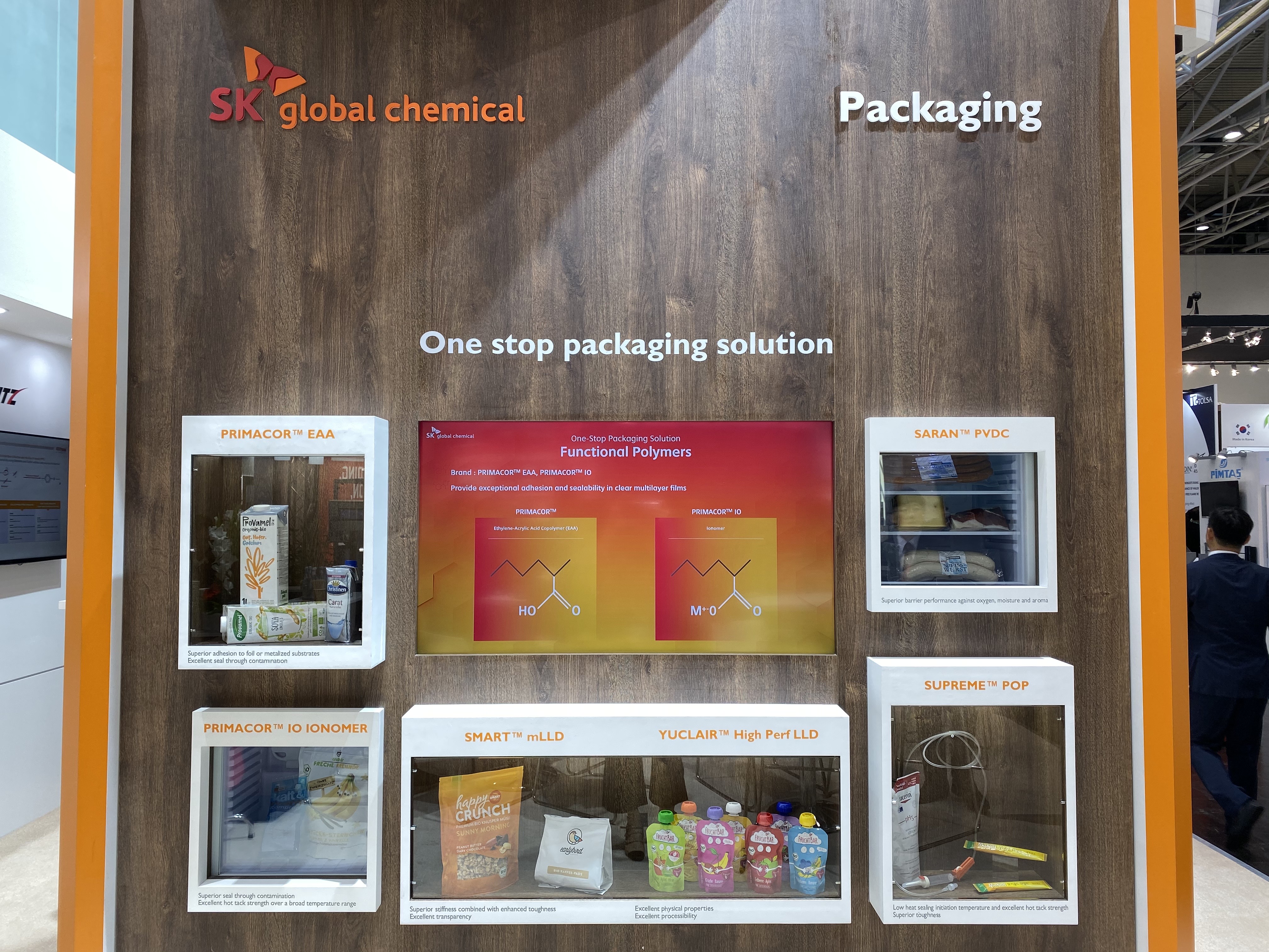 이에 기반해 패키징 존에는 다층(Multi-Layer) 필름과 6개 필름용 레진(Resin) 제품 등이 전시된다. 고성능 폴리에틸렌인 넥슬렌(Nexlene™), 고부가 포장재인 프리마코(Primacor)∙사란(SARAN™) 등이 대표적이다.