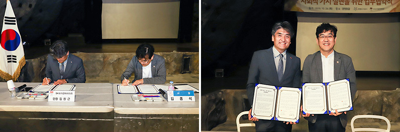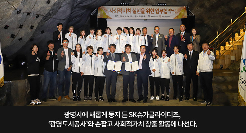 SK슈가글라이더즈는 10월 24일, 광명동굴 예술의 전당에서 광명시 산하 ‘광명도시공사’와 ‘사회적가치 실현을 위한 업무협약’을 체결했다. 이 자리에는 광명도시공사 김종석 사장, 광명시청 신민철 문화체육과장, SK슈가글라이더즈 김원근 단장 및 소속 선수 등 행사 관계자 30여 명이 참석했다.