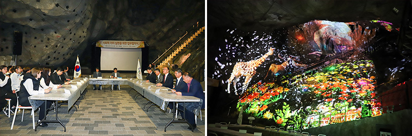 ▲ 업무협약식이 진행된 광명동굴 예술의 전당(좌)과 미디어파사드 쇼(우)