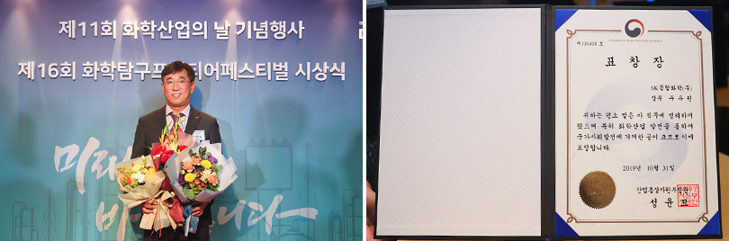 ▲ 제11회 ‘화학산업의 날’에서 산업통상자원부 장관표창을 수상한 SK종합화학 주우원 공장장과 상장